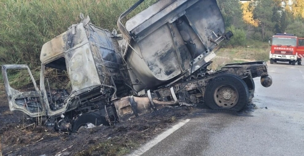 Um pesado despistou-se esta segunda-feira, 6 de outubro, na estrada de acesso à A14, na zona de Vila Verde, Figueira da Foz, provocando um incêndio que consumiu a galera do veículo.
