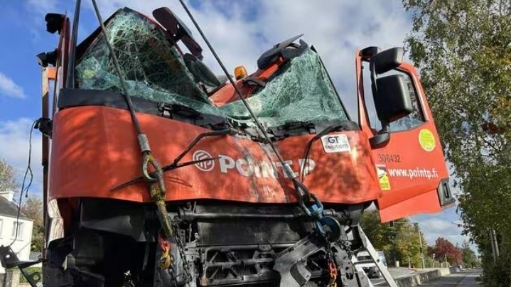 Quimper (Finistère), 16 de outubro de 2025 — A circulação ficou fortemente perturbada na entrada de Quimper, esta quinta-feira, após a saída de estrada de um camião de grande porte.