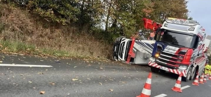 Na manhã desta terça-feira, um caminhão tombou na estrada nacional RN12, na região da Bretanha, França. O acidente ocorreu por motivos ainda não esclarecidos e mobilizou rapidamente as equipes de emergência.