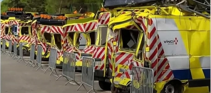 Na imagem, é possível ver várias viaturas de intervenção rodoviária fortemente danificadas após terem sido atingidas por outros veículos durante operações de assistência em autoestradas francesas. Os veículos, pertencentes à empresa de manutenção Vinci, exibem danos extensos na dianteira e nas laterais, evidenciando o risco elevado a que estes profissionais estão diariamente expostos.