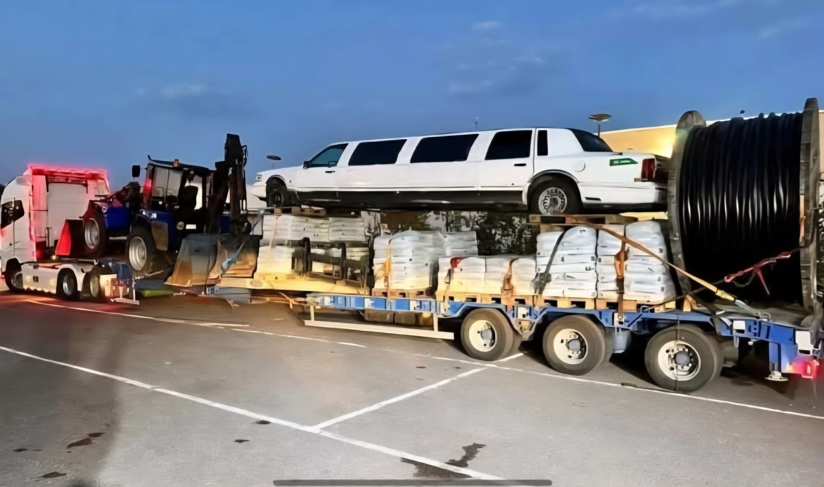 Uma imagem insólita está a circular nas redes sociais após ter sido partilhada pela página UKcheckpoints.info. A fotografia mostra um camião a transportar uma carga pouco comum: uma longa limusina branca colocada por cima de paletes e materiais diversos, tudo preso a uma plataforma já bastante preenchida.