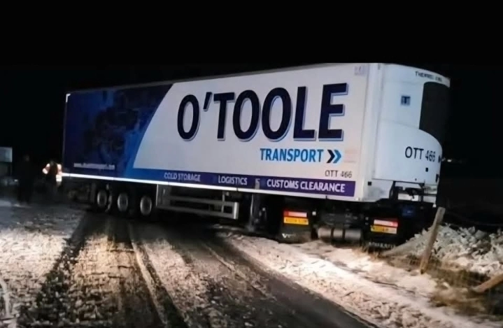O veículo pesado, pertencente à transportadora O’Toole, deslizou na via coberta de neve e gelo, acabando atravessado na estrada. De acordo com informações divulgadas o acidente ocorreu em condições meteorológicas adversas, com o piso extremamente escorregadio, o que dificultou a circulação e aumentou o risco de novos incidentes.