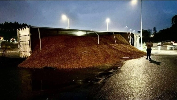 A carga do camião, serrim, espalhou-se pela via. Não houve registo de feridos.