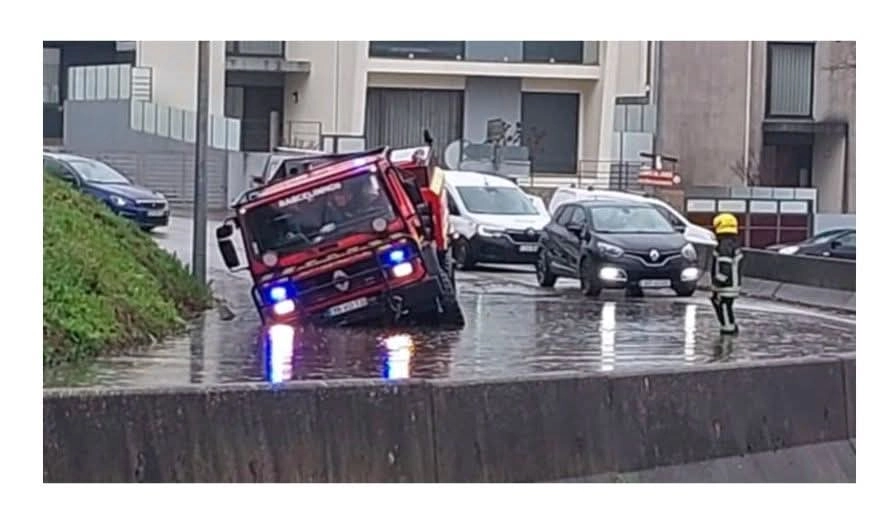 Um camião dos Bombeiros de Barcelinhos ficou preso, na manhã desta segunda-feira, depois de o piso ter cedido numa estrada inundada no concelho de Barcelos.