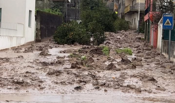 A força da água terá arrastado detritos e pedras para a estrada, tornando-a intransitável. Um veículo parece ter ficado cercado pela lama, o que ilustra a dimensão dos estragos causados pelo mau tempo que se tem feito sentir na região.