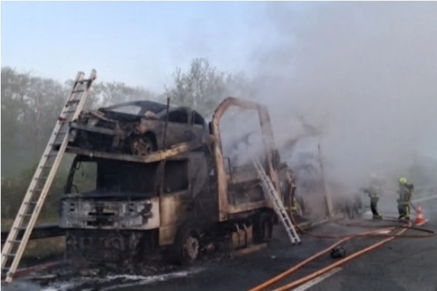 Um camião com reboque que transportava carros pegou fogo na manhã de quinta-feira em Nervieux, na A72, na direção Clermont-Ferrand, em direção a Saint-Étienne, causando grandes engarrafamentos.