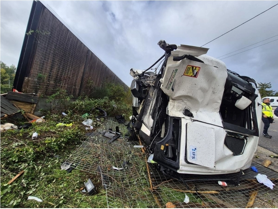 O camião, que carregava flores, deixou a estrada. A cabine passou pela parede de cancelamento de ruído em frente ao restaurante,e ficou deitada na estrada departamental.