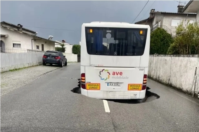 Um autocarro caiu num buraco depois de a estrada em que circulava ter aluido em Oliveira de S. Mateus, Famalicão.