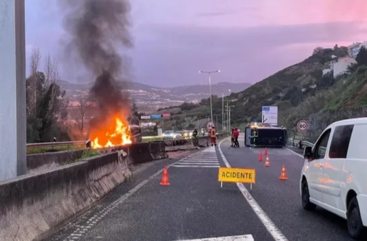 Um carro incendiou-se, na manhã deste domingo, junto à saída do túnel do Grilo, em direção a Loures, em Lisboa, após ter sofrido um despiste.