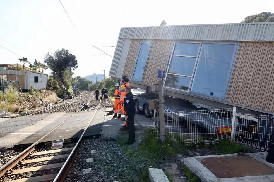 O acidente ocorreu numa passagem de nível considerada delicada, com desnível acentuado. Dois transportes excecionais seguiam em direção ao destino final por uma estrada secundária da Côte d’Azur, onde iriam efetuar a entrega de bungalows.